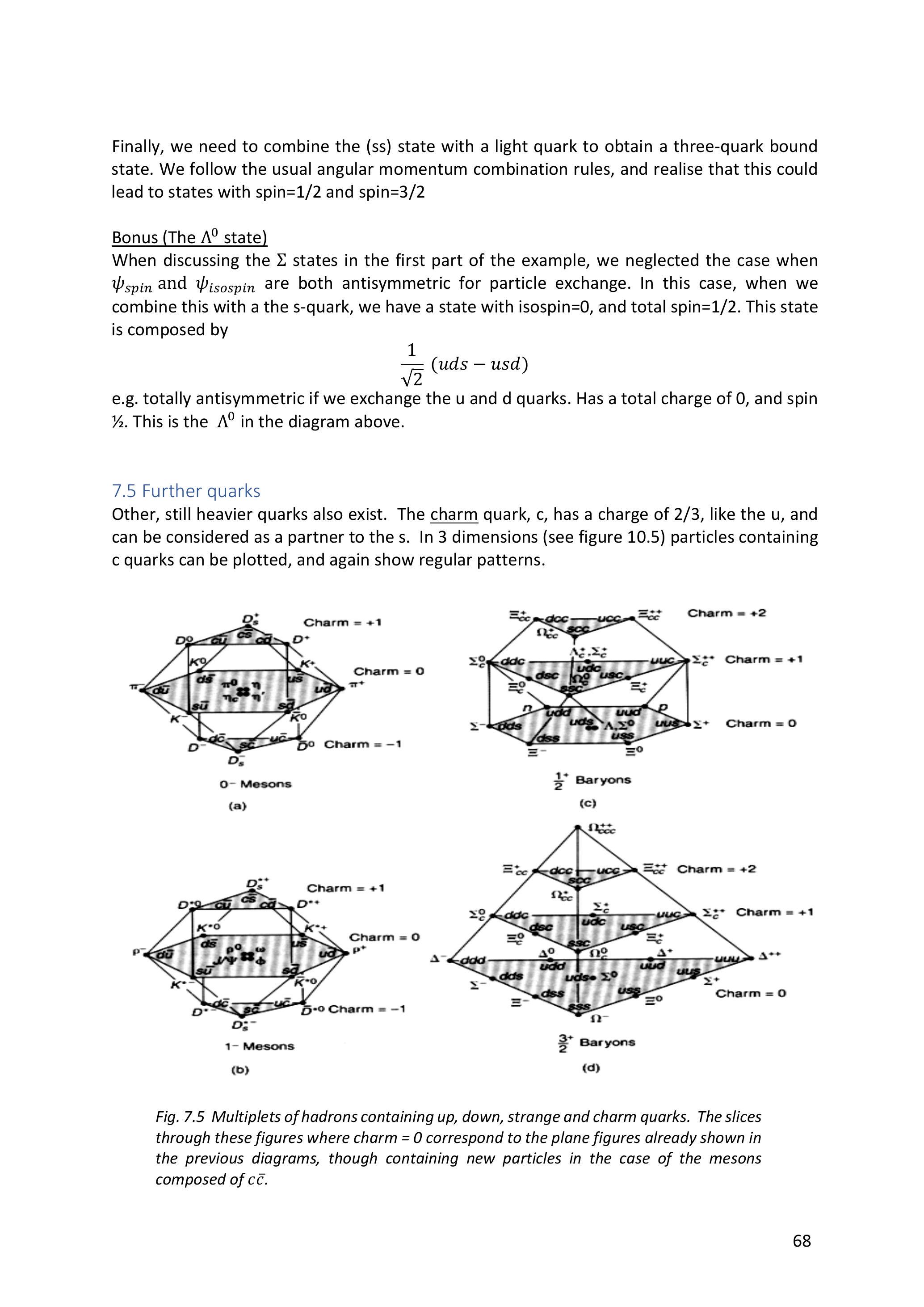 e.g. totally antisymmetric if we exchange the \(u\) and \(d\) quarks. Has a total charge of 0 , and spin \(1 / 2\). This is the \(\Lambda^{0}\) in the diagram above.