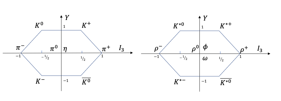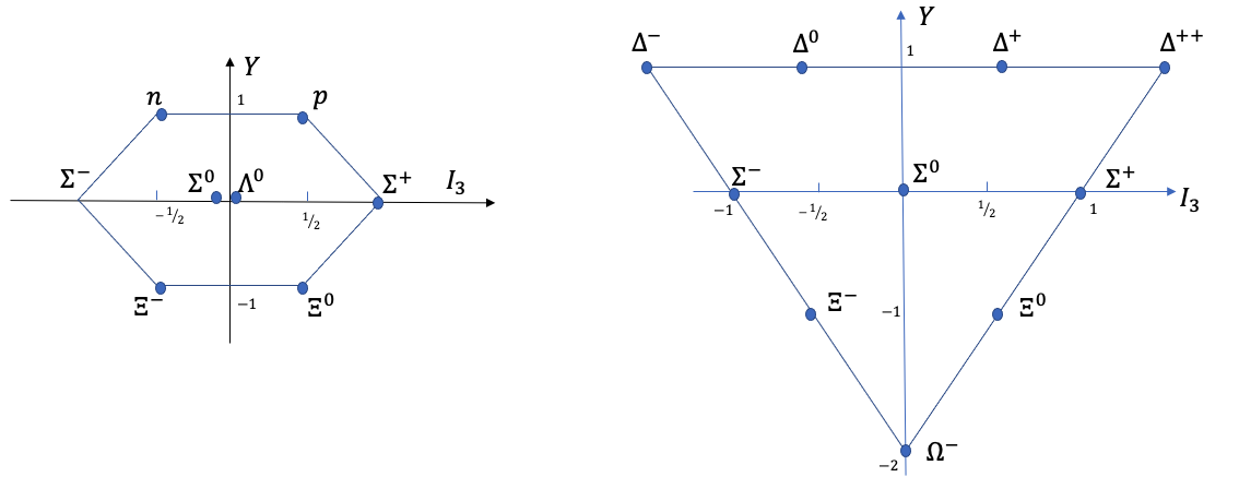 Families of particles with similar properties (e.g. same spin and parity) can be plotted in terms of \(Y\) versus \(I_{3}\), and form regular geometrical patterns (see Fig. 7.1 and Fig. 7.2 and Table 7.1):